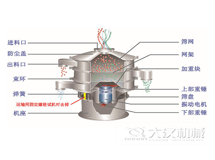 直排篩由進(jìn)料口、防塵蓋、電機(jī)、彈簧、出料口組成。兩臺(tái)型號(hào)相同的振動(dòng)電機(jī)對(duì)稱安裝在篩機(jī)兩側(cè),振動(dòng)電機(jī)上、下端裝有偏心重錘,通過改變上下偏心塊的相位角和重量,可以改變激振力的大小和物料的運(yùn)動(dòng)軌跡,進(jìn)而達(dá)到篩分各種物料的目的。
