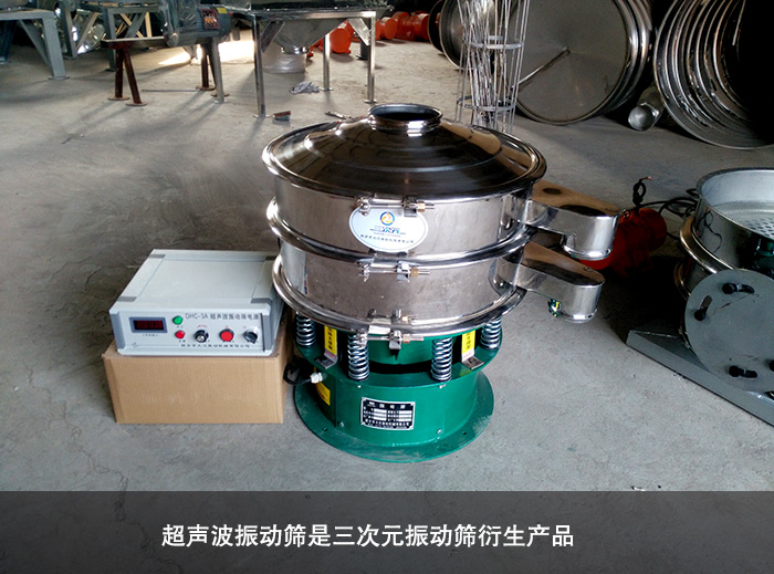 超聲波振動篩是三次元振動篩衍生產品,它是在普通的三次元振動篩的篩網加裝引入一個低振幅,高頻率的超聲波振動篩。此結構的改動很大程度上提高了其對微細粉的效率,并且還解決了物料因團聚,靜電,強吸附性而導致的堵網等難題。且此振動篩也能夠多層篩分。